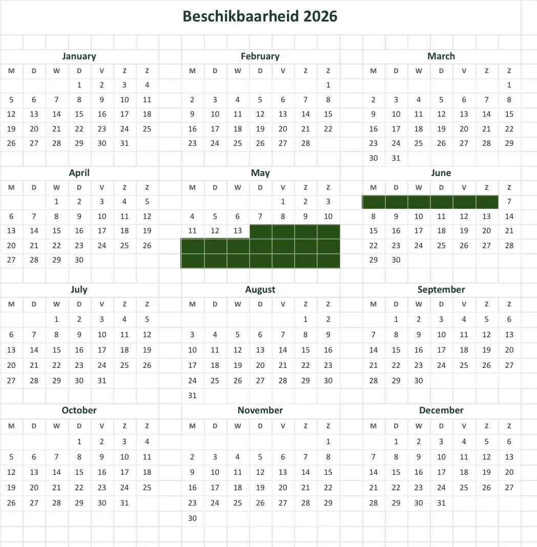 In de agenda hieronder zie je in één oogopslag welke periodes vrij en bezet zijn.